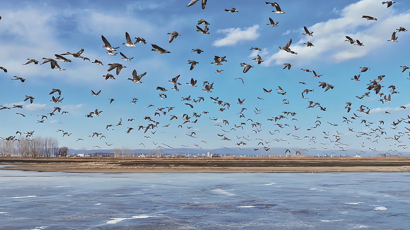 在田间地头、解冻后的浅滩洼地里,成群大雁收拢宽大羽翼,悠然驻足休整,它们或低头啄食寻觅泥土中的天然饵,或成群静卧养精蓄锐,密密麻麻的身影铺满开阔田地与浅滩。头顶的天空之上,则是另一番灵动壮阔的景象,成群大雁不时振翅腾空,翅膀拍打空气的声音浑厚有力,它们自发排成规整的“人”字形与“一”字形长队,队列连绵上百米,伴着和煦春风缓缓向北飞行。