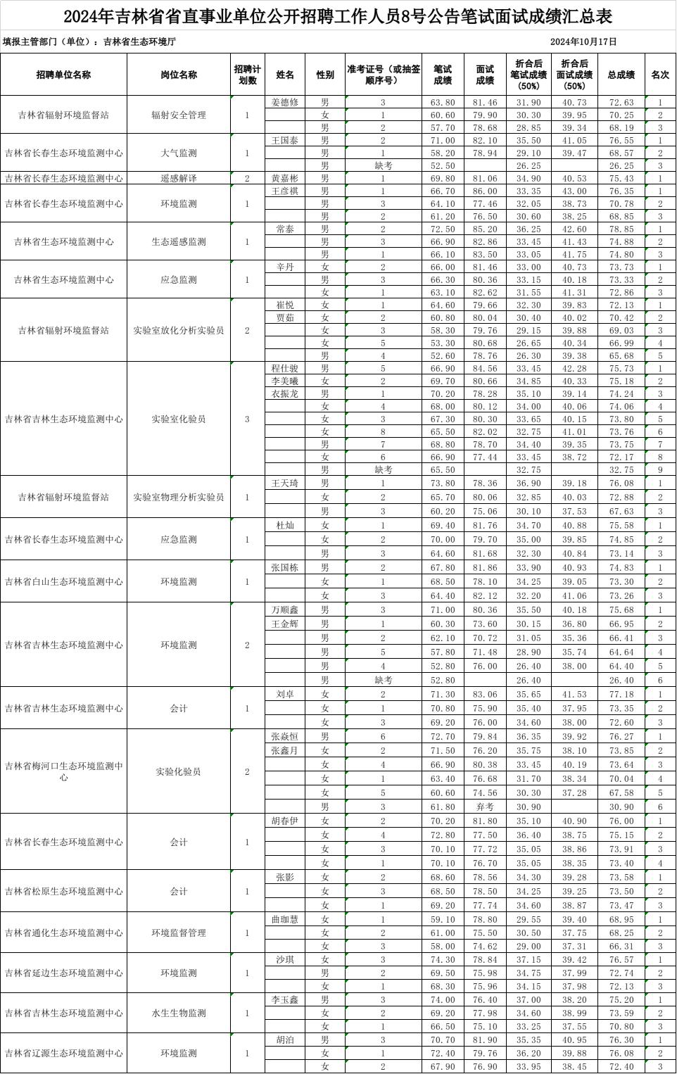 2024年吉林省省直事业单位公开招聘工作人员8号公告笔试面试成绩汇总表