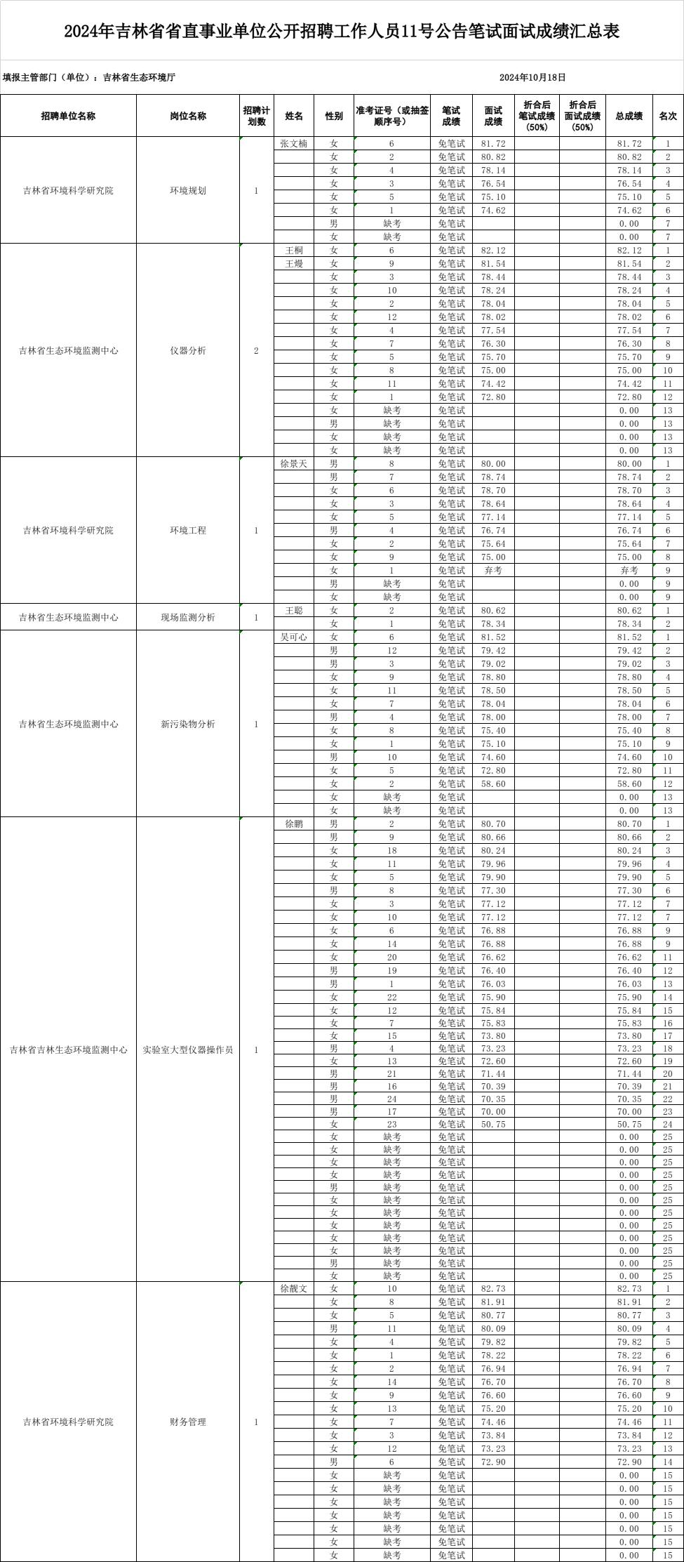 2024年吉林省省直事业单位公开招聘工作人员11号公告笔试面试成绩汇总表