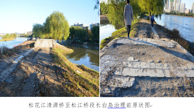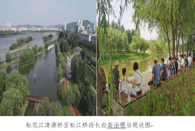 (二)生态治理效果。松花江(吉林市城区段)下游有2座污水处理厂负责吉林市城区污水处理任务,百里生态长廊长白岛段湿地水生态修复工程既对河岸滩地进行了修复,又通过恢复湿地增强了水动力。近年来,以生态廊道、生态缓冲带为主体,共实施水环境生态修复面积135万㎡,对重点河清淤,使河道河床平整、美观。