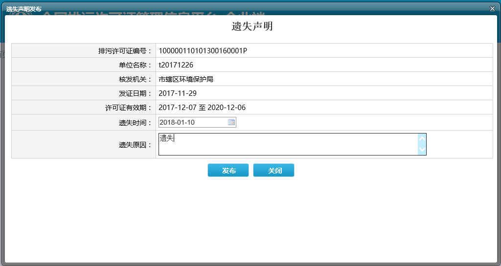 | o遗失排污许可证的,在申请补领前应当在全国排污许可证管理信息平台上发布遗失声明。 | ||